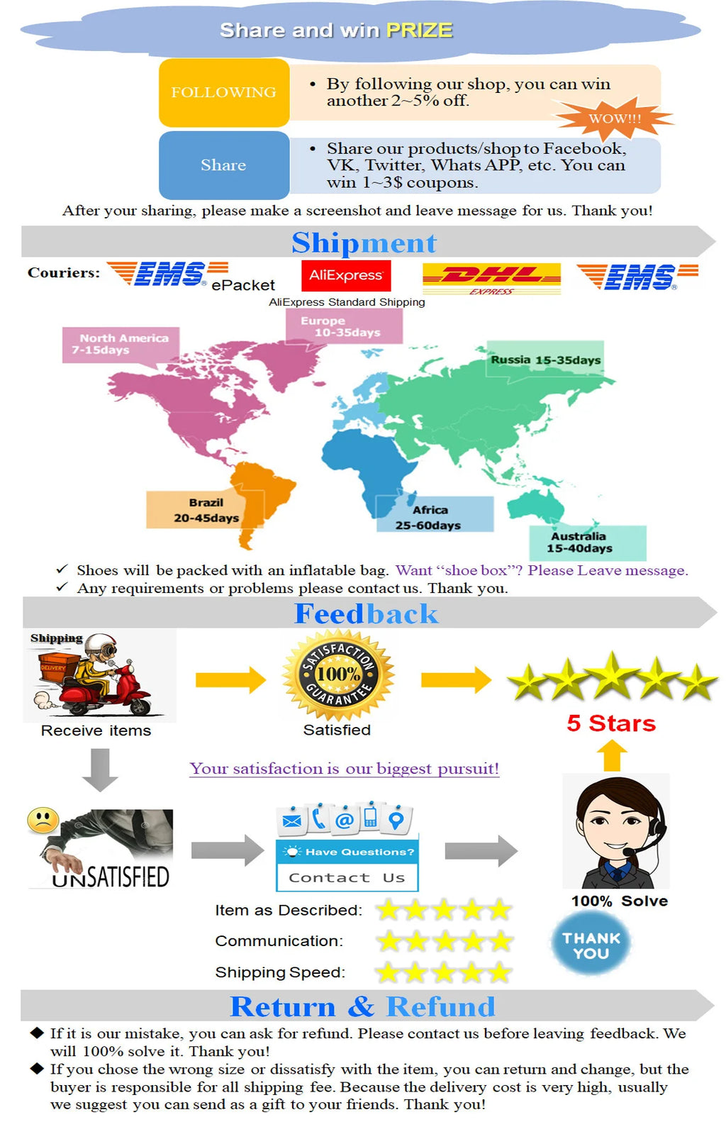 1️⃣ - The size of Chinese shoes is generally smaller than shoes in other countries such as Europe, Brazil, Mexico, and Russia etc., So please select the correct size according to our size instructions in stead of your shopping habit.